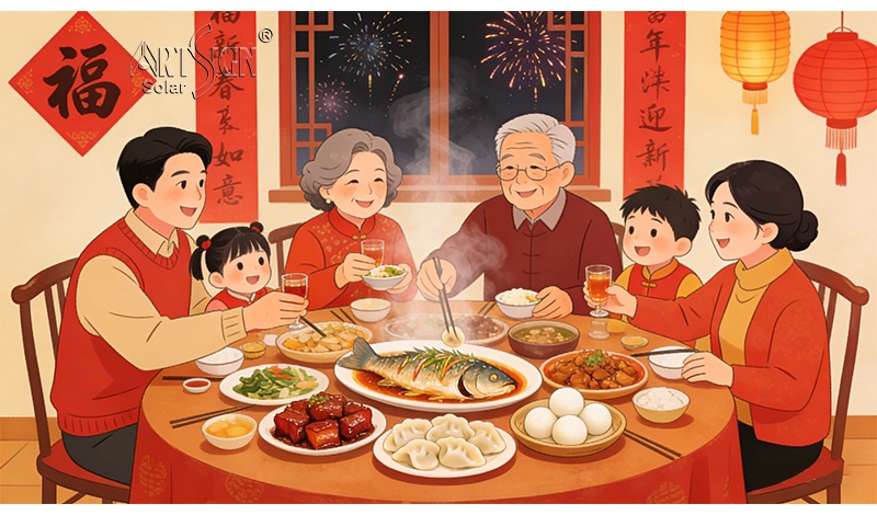On the eve of the Spring Festival, families come together, do a thorough cleaning, symbolizing the removal of bad luck. Then, they paste red couplets on the doors and windows, praying for continuous good fortune and happiness in the coming year. The most exciting part is the reunion dinner, where the family gathers together, enjoys delicious food, and shares their thoughts. As midnight approaches, family members "stay up late", believing that this will bring longevity to their parents. At the same time, elders will give red envelopes to the younger generations, symbolizing blessings and the continuation of good luck.